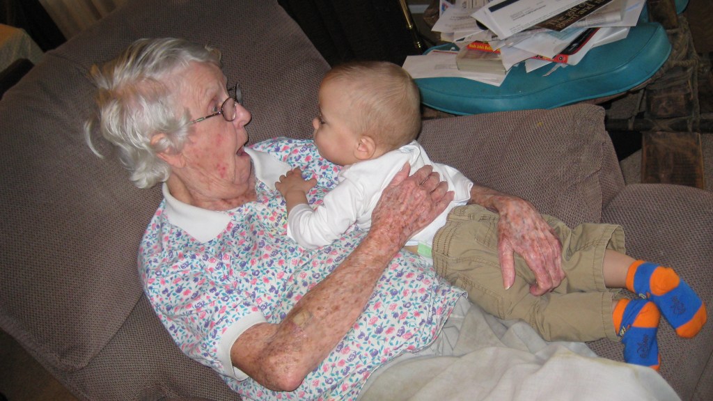Mom was already declining in health and mental capacity when my son was born prematurely (you can read about that here). She and Dad made it down to meet him when he was four months adjusted. She did her trademark baby talk/cooing at him and said: “I love you, Corbin, and when you get to know me, you’ll love me too.” The connection was instantaneous.