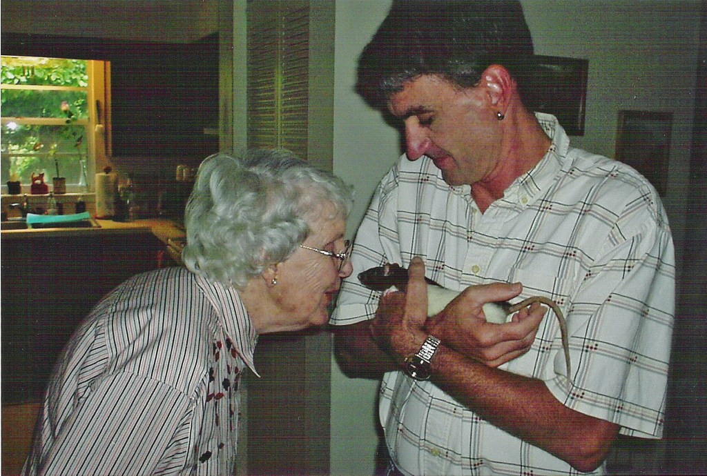 Even animals sensed this gentle, loving nature of hers. The first pet my wife, Kim, and I owned was a female rat, named Kaya. Kaya loved Kim, but as is often typical with pets of opposite gender, adored me. She was even a bit jealous of Kim, and an otherwise gentle animal, could be quite nippy with any other females competing for my attention. Not so with Mom. Mom first met Kaya when she was a kitten, and called her our little mouse even after Kaya had grown quite large. Even when Kaya had aged, and grown a bit grumpy, she still clearly loved Mom.